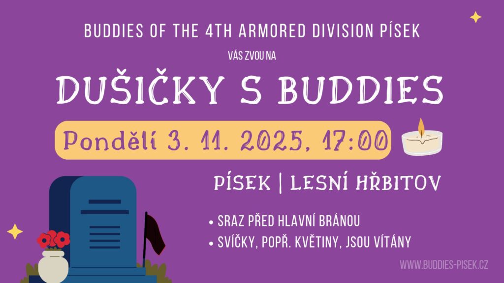 Stalo se již tradicí, že si každoročně, v čase kolem Dušiček, členové Buddies připomínají významné písecké osobnosti květnového osvobození americkou armádou v roce 1945. Přijďte s námi uctít památku těch, kteří pomohli do Písku dostat svobodu…